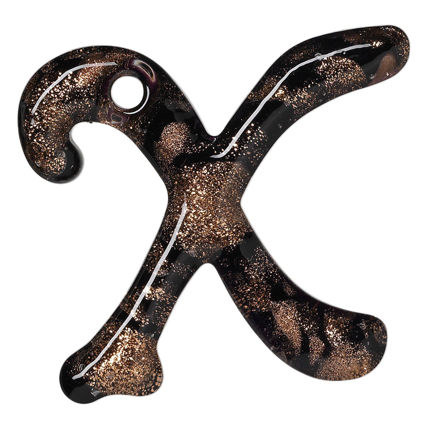 Lampworked glass letter "X" lets you personalize jewelry in style. With a large drill hole (3.5-4.5mm), the focal is easy to string onto cord, ribbon or chain. Use with other letters to spell out a word or name, or use alone for an initial. Sophisticated black letter is accented with copper-colored glitter. In each lot of handcrafted items, colors, shapes and sizes may vary.