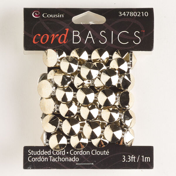 Cord, acrylic, gold, 10mm flat with round studs. Sold per pkg of 1 meter.