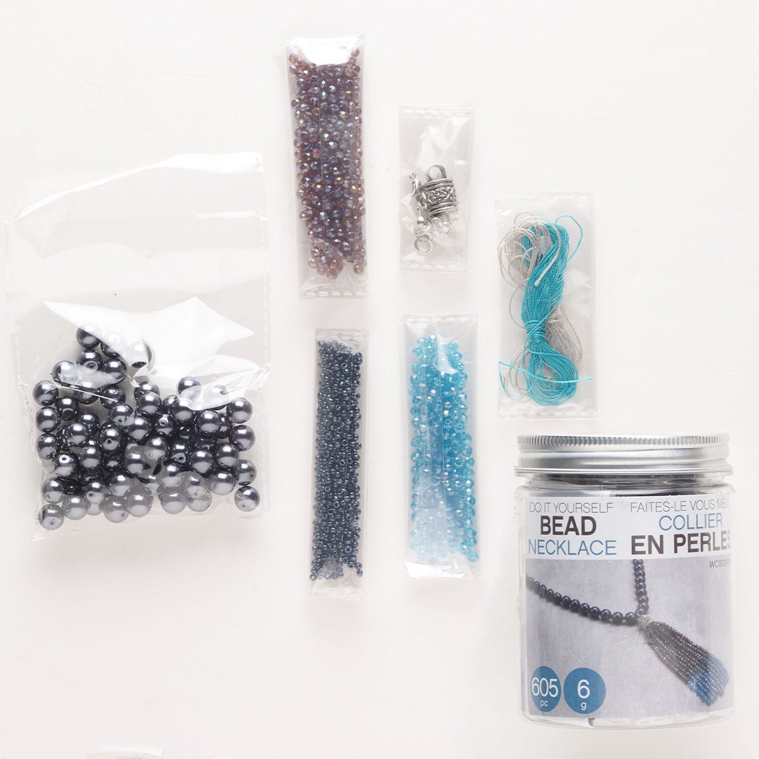 Package includes (1) 230-inch light blue nylon cord; (1) 69-inch grey cord; (1) 10x9.5mm glue-in cord end; (1) 10x6mm lobster claw clasp; (4) 6mm round 18-gauge jump rings; (4) 4.5x4mm clamshell cord clips; (6) 2x1mm crimp beads; (6 grams) grey 6/0 round seed beads; (72) 8mm grey glass round beads; (215) 4x3mm faceted light blue rondelles and (300) 4x3mm faceted purple rondelles.