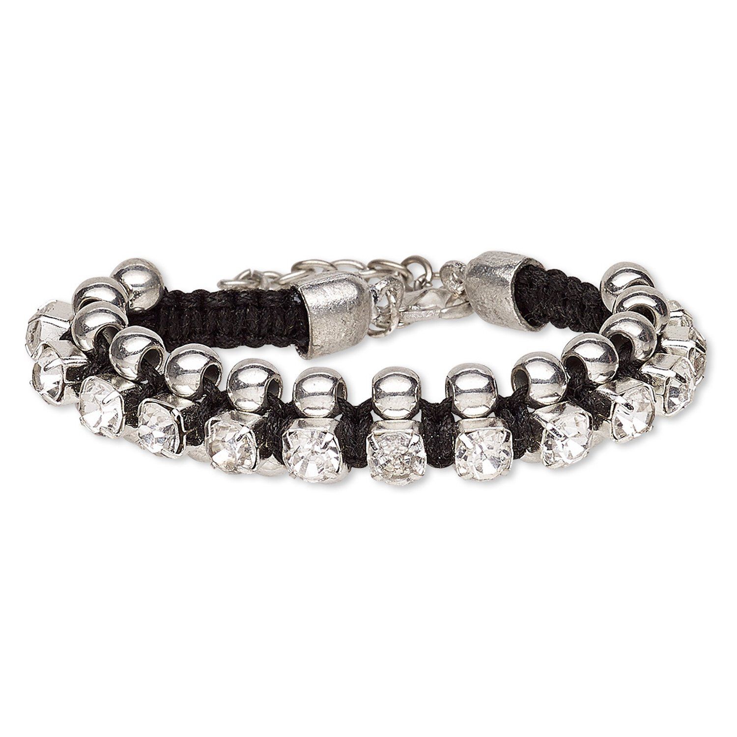 Shimmering glass rhinestones and silver-finished brass beads sparkle on the black background of this ready-to-wear bracelet made of waxed cotton cord, and features a lobster claw clasp. Ideal for gift giving, counter sales or extending current jewelry lines.