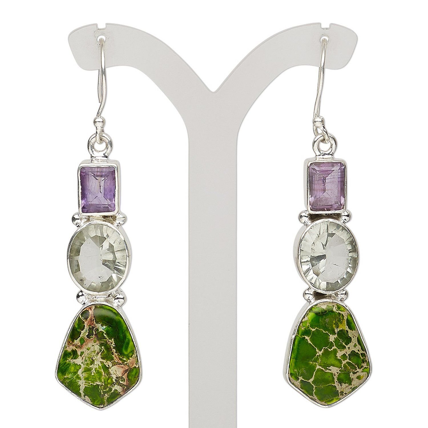 Earring, green quartz (heated) / amethyst / magnesite (dyed / stabilized) / sterling silver, apple green, 2-1/2 inches with fishhook ear wire, 21 gauge. Sold per pair.