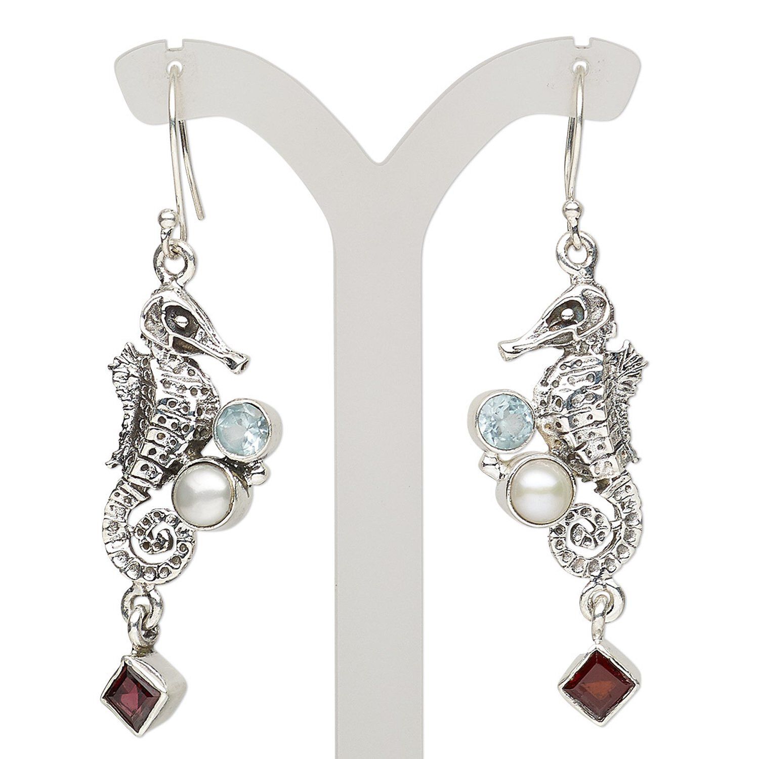Earring, sky blue topaz / garnet (irradiated) / cultured freshwater pearl (bleached) / antiqued sterling silver, 2-1/4 inches with seahorse and fishhook ear wire, 21 gauge. Sold per pair.