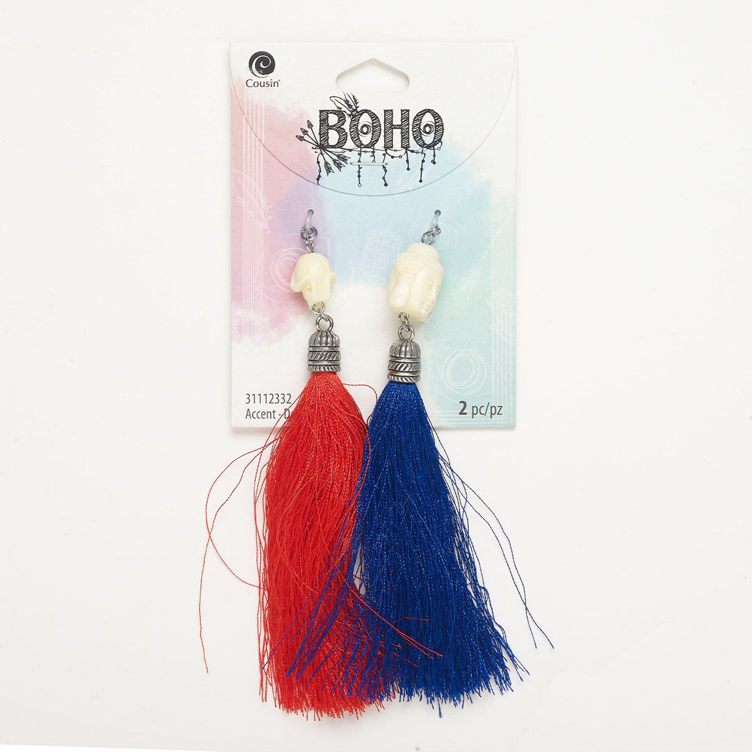 Trendy tassel focals feature acrylic beads resembling carved bone or ivory in skull and Buddah head designs. Colors include red, blue and cream. Some items may have a tarnished finish, but can be cleaned with tarnish-removing cleaners.