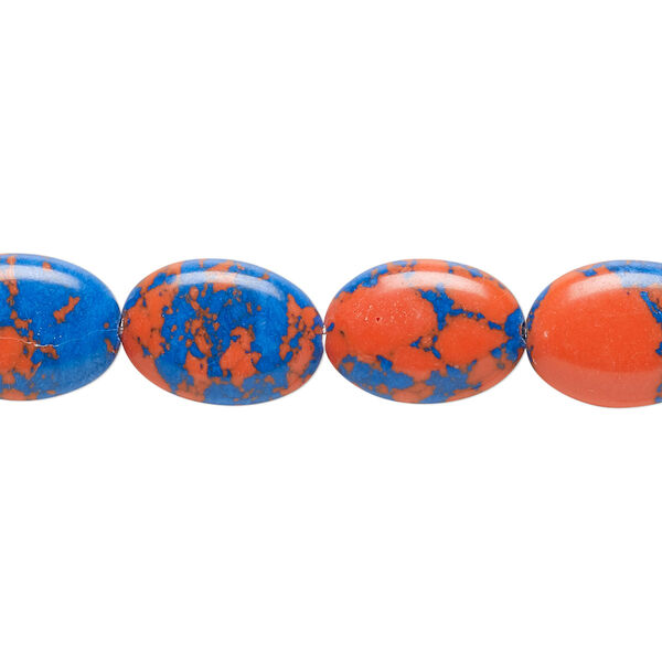 Bead, resin, dark blue and orange, 14x10mm flat oval. Sold per 15" to 16" strand.