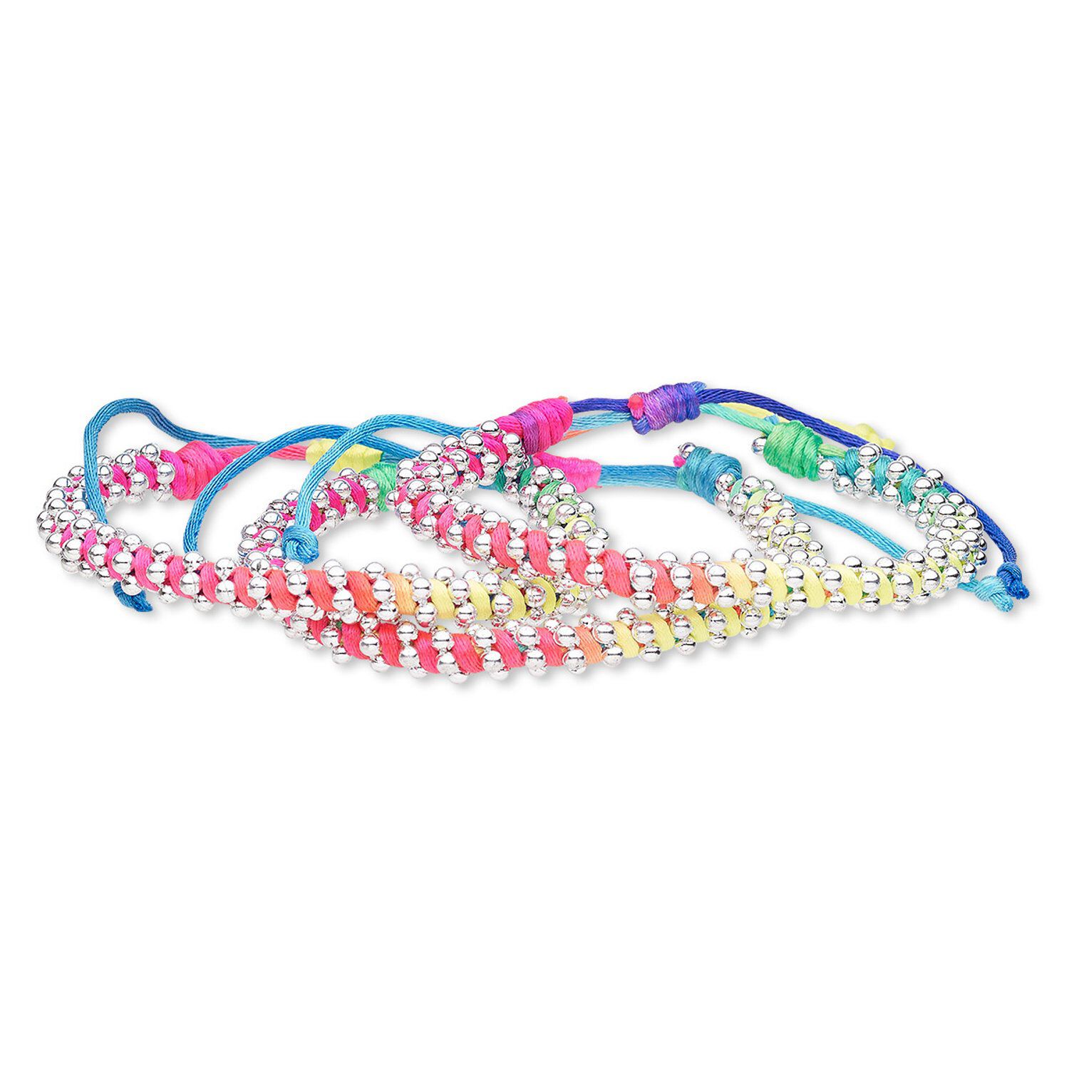 Bracelet mix, nylon and silver-coated plastic, multicolored, 8mm wide, adjustable from 6 to 8-1/2 inches with wrapped knot closure. Sold per pkg of 3.