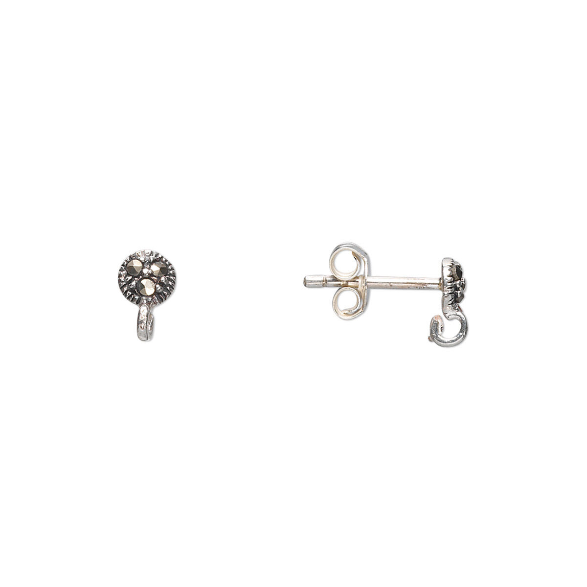 Marcasite / sterling silver 1pkg2, round earstud / open loop / earnut natural 4mm