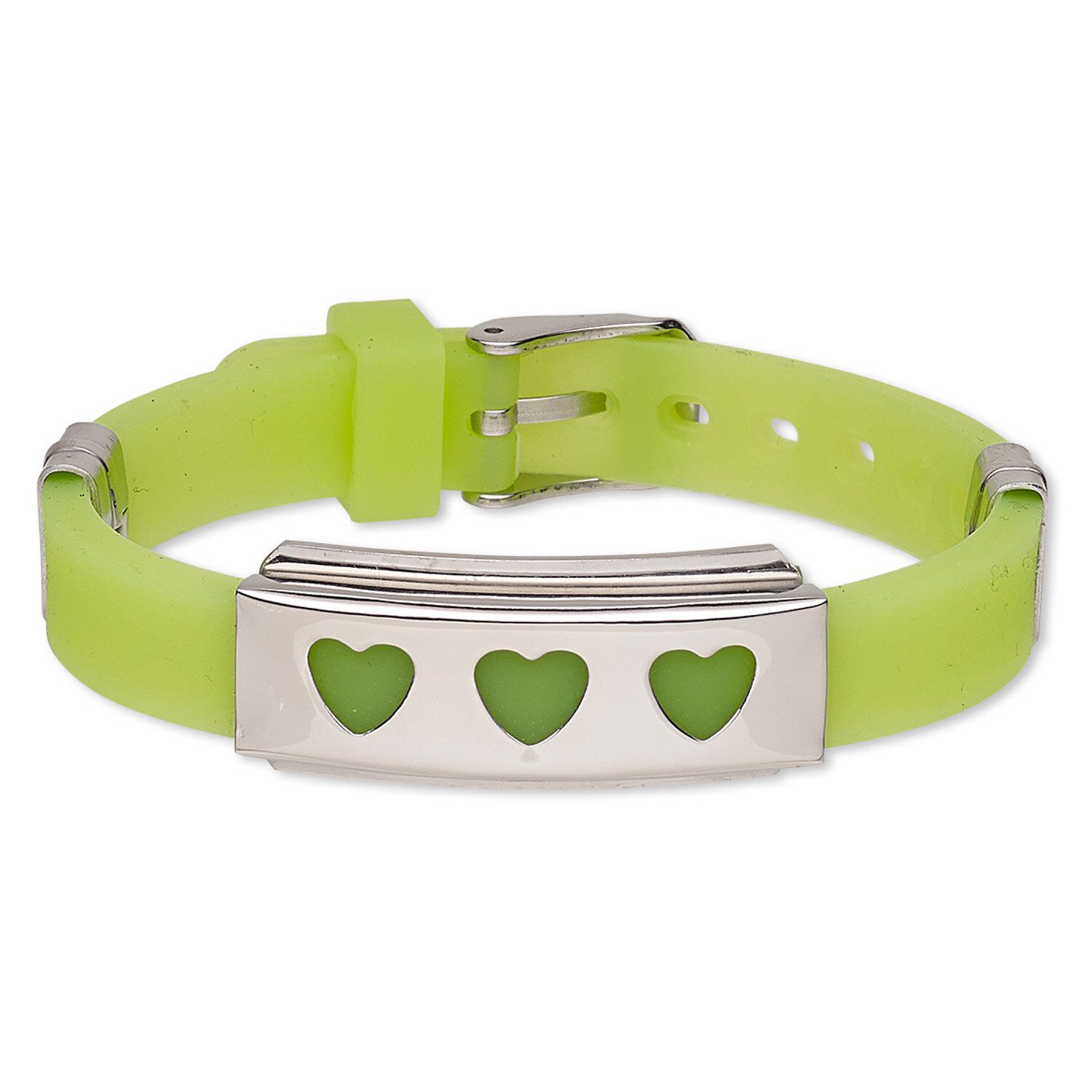 Bracelet, Softique™, silicone and stainless steel, light green, 16mm wide with 39x16mm rectangle and cutout hearts, adjustable from 5-1/2 to 7-1/2 inches with buckle-style closure. Sold individually.