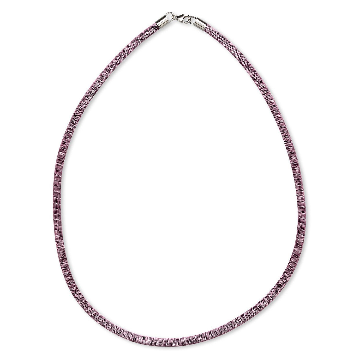 Fine, Italian brass mesh necklaces--perfect for large-bail pendants and large-hole beads. 3-4mm leatherette cord inserted into lavender-colored brass mesh for vivid contrast. Imitation rhodium-finished sterling silver lobster claw clasp. Necklace fits beads or large bails with a 6mm or larger hole size.
