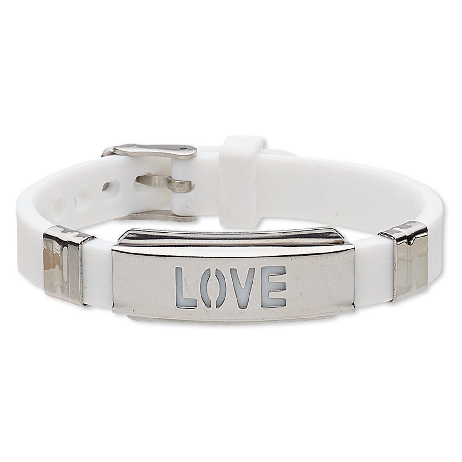 Bracelet, Softique™, silicone and stainless steel, white, 16mm wide with 39x16mm curved rectangle and cutout "LOVE," adjustable from 5-1/2 to 7-1/2 inches with buckle-style closure. Sold individually.