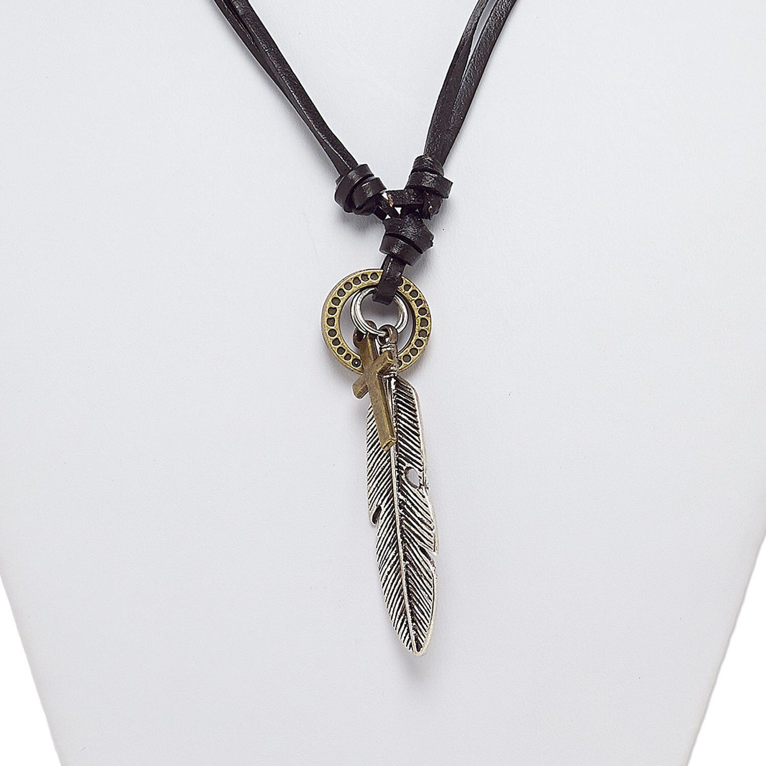 Adjustable leather necklace features an antique silver plated ring, cross and feather. Colors, shapes and sizes may vary in each lot. Testing for colorfastness is recommended.