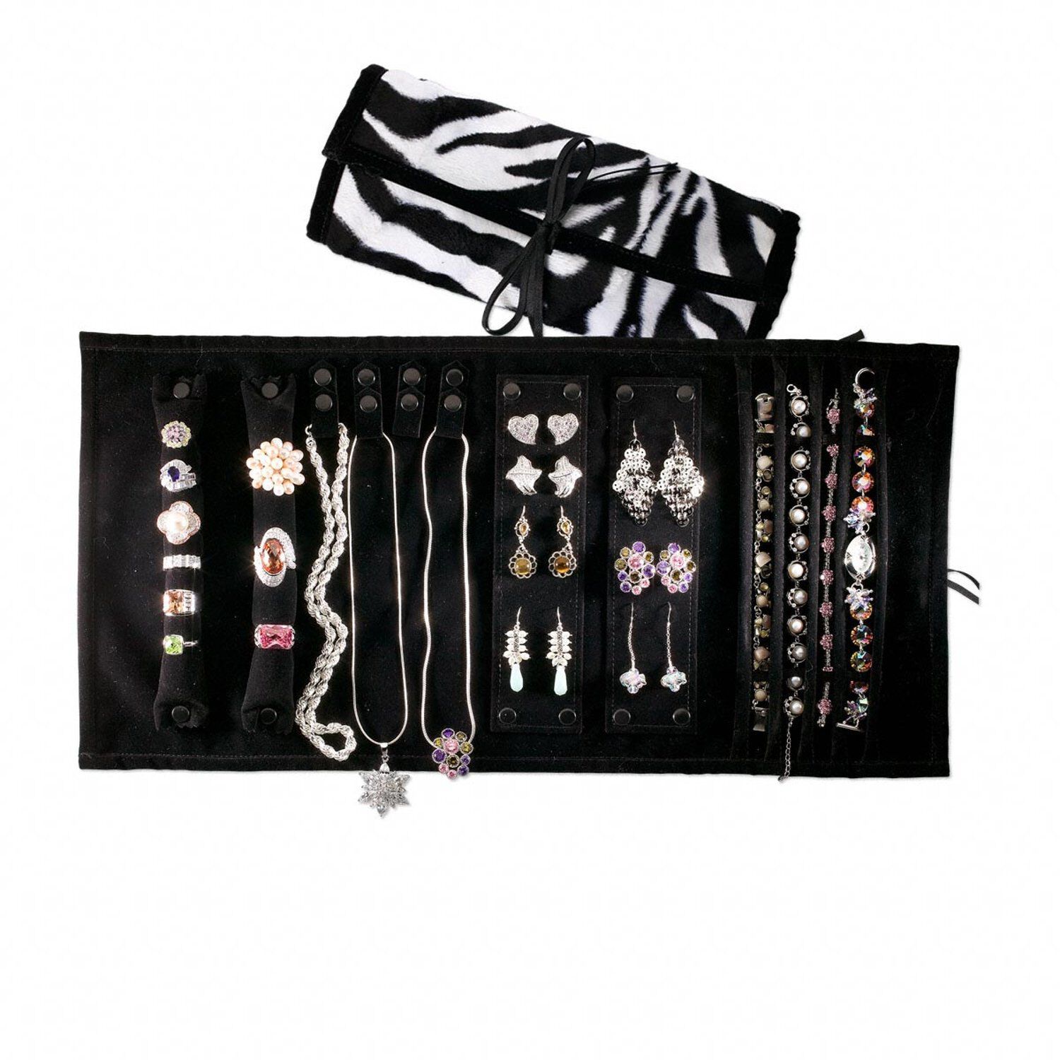 Jewelry roll, polyester and leatherette, zebra print with ribbon tie, 19 x 9-1/2 inches, 9-1/2 x 6 inches folded. Sold individually.