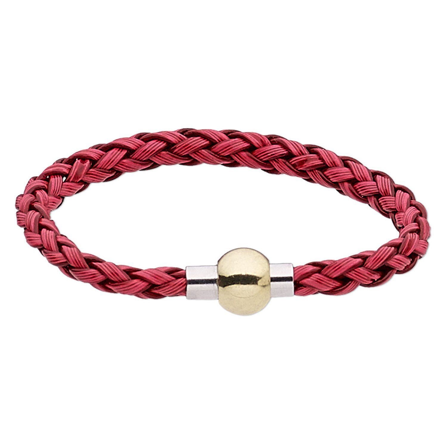 Bracelet, imitation leather with gold- and silver-finished "pewter" (zinc-based alloy), red, 6mm wide braided round, 7 inches with magnetic clasp. Sold individually.