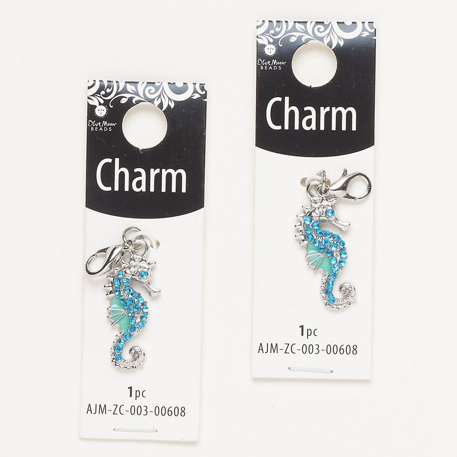 Charm, silver-finished enamel "pewter" (zinc-based alloy) / steel / glass, blue and light blue, 24x12mm single-sided seahorse with lobster claw clasp. Sold per pkg of 2.
