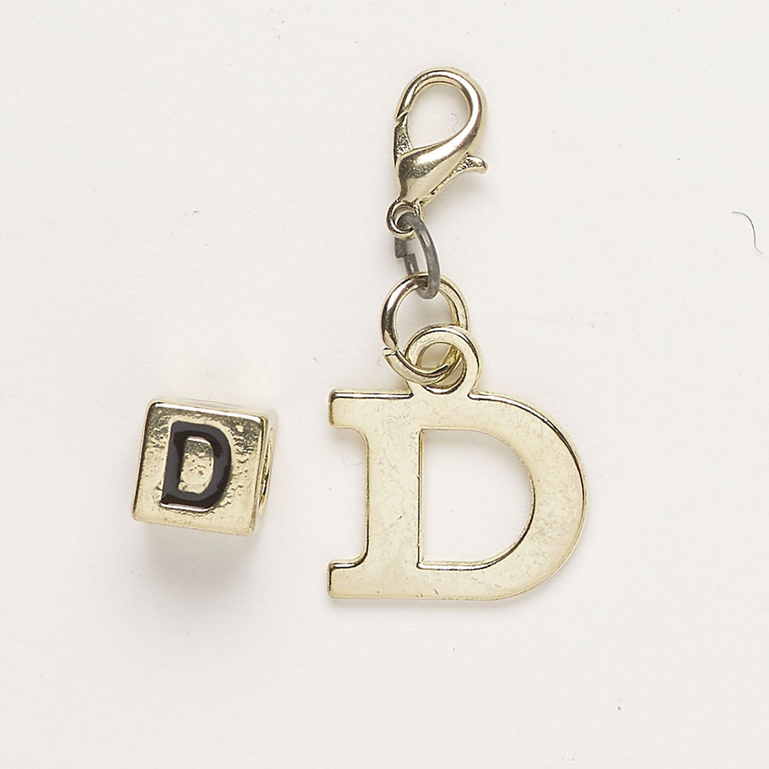 Bead and charm, brass-finished "pewter" (zinc-based alloy) / steel / enamel, black, 7mm cube with alphabet letter "D" and 15x12mm alphabet letter "D" with lobster claw clasp. Sold per pkg of 2.
