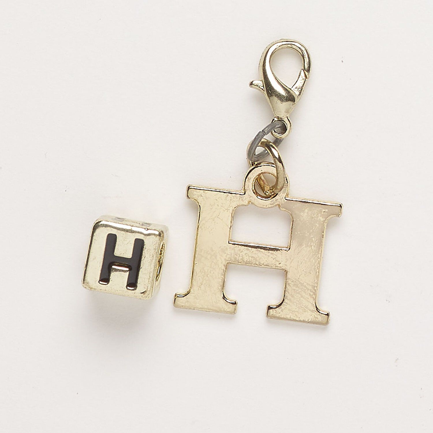 Bead and charm, brass-finished "pewter" (zinc-based alloy) / steel / enamel, black, 7mm cube with alphabet letter "H" and 16x13mm alphabet letter "H" with lobster claw clasp. Sold per pkg of 2.