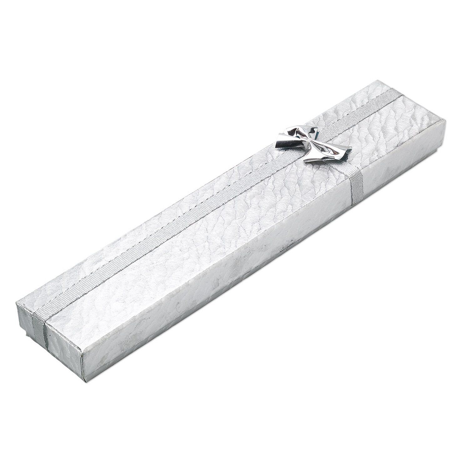 Gift box, paper and foam, silver and white, 8-1/4 x 1-1/2 x 3/4 inch rectangle with ribbon and bow. Sold per pkg of 12.