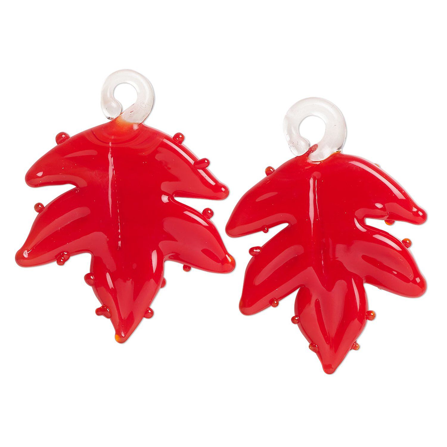 Drop, lampworked glass, opaque red, 25x24mm handmade single-sided beaded maple leaf. Sold per pkg of 2.