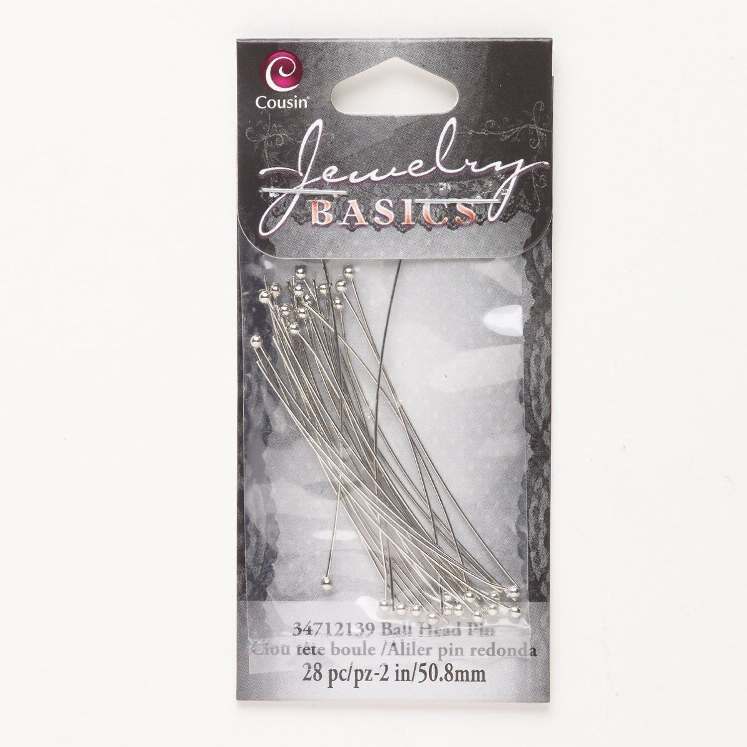 Head pin, brass, pkg/28, silver finish, 2 inches with 2.5mm ball, 22 gauge.
