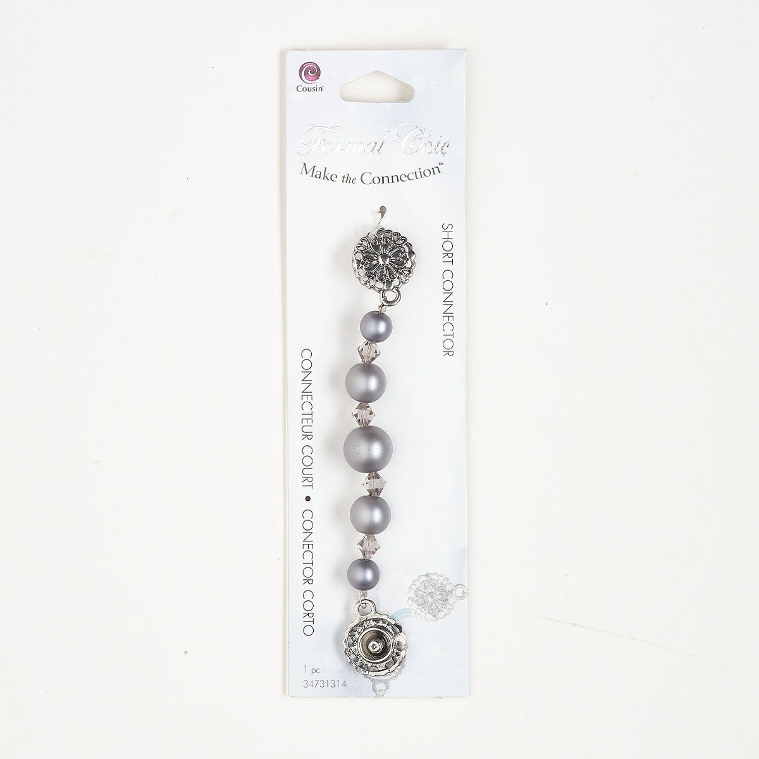 Connector, silver-finished brass / glass / acrylic, grey and pearlescent grey, 7-12mm round and 6mm bicone. Sold per pkg of 4-1/2 x 1/2 inches.