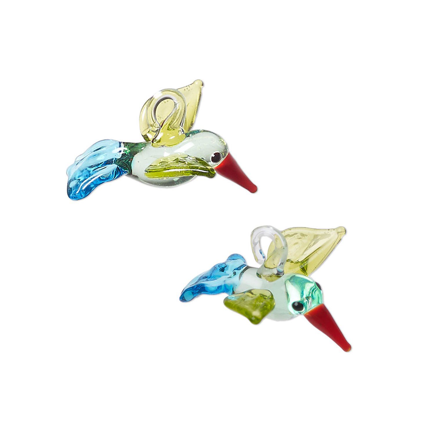 Drop, lampworked glass, multicolored, 20x14mm hummingbird. Sold individually.