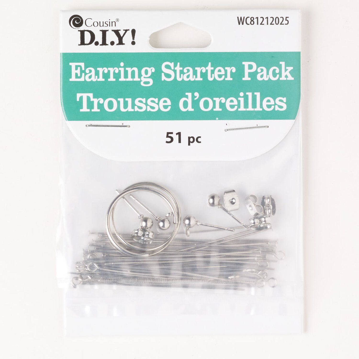 Package contains (1 pair) 21mm earring hoops, (20) 2-inch 22-gauge head pins, (19) 2-inch 22-gauge eye pins, (2 pairs) 6mm round earstuds with earnuts and (2) 6x4mm additional earnuts.