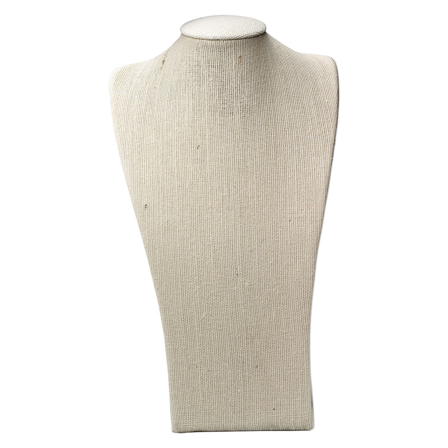 Neutral color, soft texture and sleek lines combine for truly eye-catching displays. Necklaces elegantly drape over "shoulders," and "U" pins easily insert on top and front. Sturdy wood and fiberboard base, white cardboard backing and woven hemp covering with padded neck. An elastic band on the back secures jewelry. Since hemp is a natural product colors may vary from off-white to antique ivory. Colors, shapes and sizes may vary in each lot.