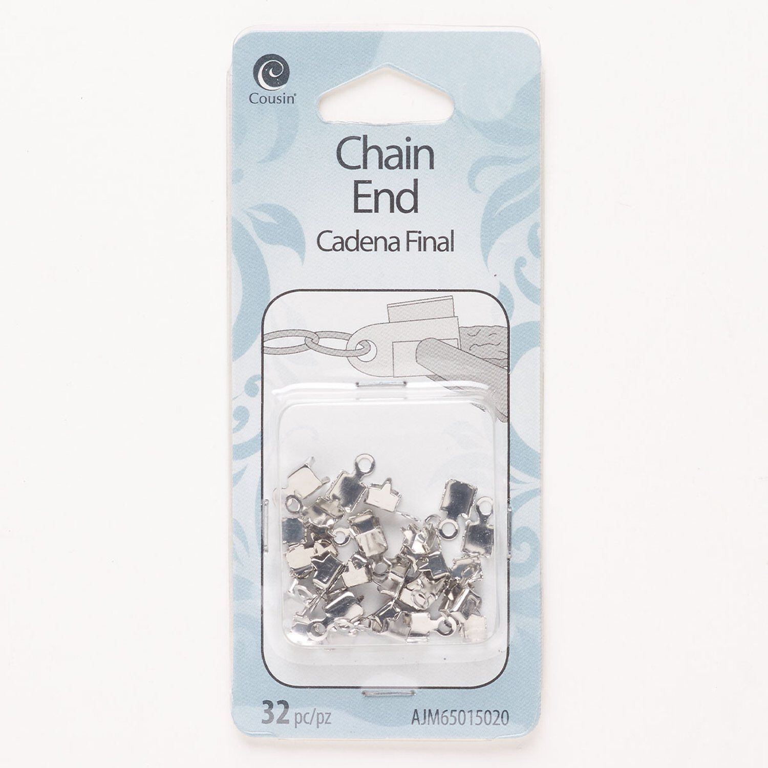 Cord/chain end, brass, pkg/32, silver finish, 7x5mm fold-over.