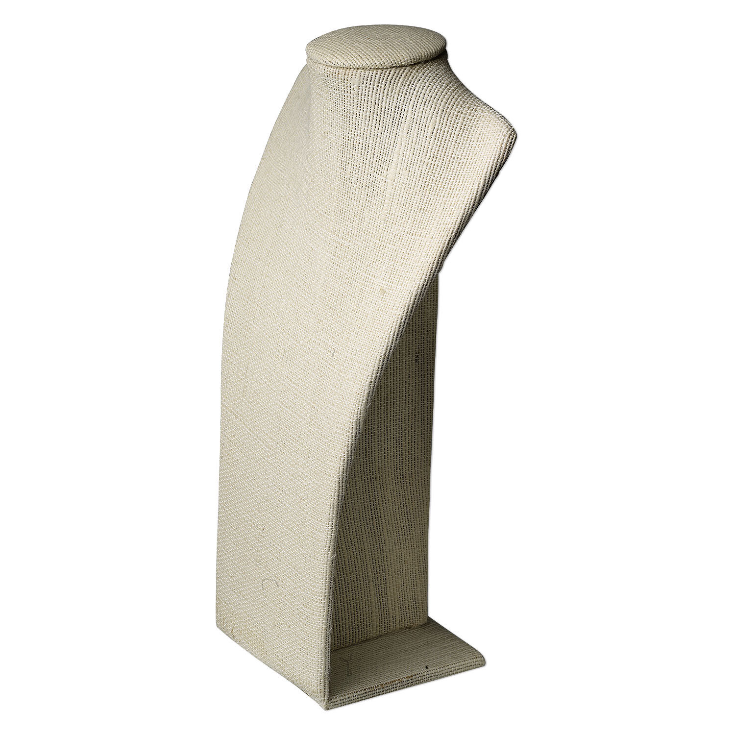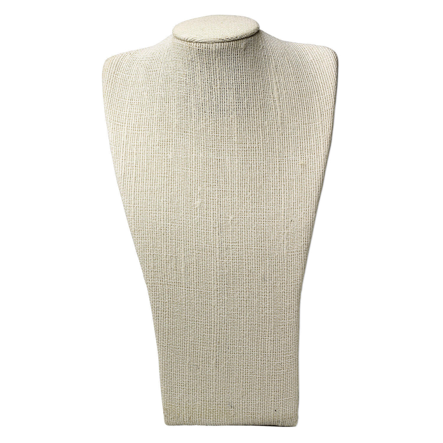 Neutral color, soft texture and sleek lines combine for truly eye-catching displays. Necklaces elegantly drape over "shoulders," and "U" pins easily insert on top and front. Sturdy wood and fiberboard base, white cardboard backing and woven hemp covering with padded neck. An elastic band on the back secures jewelry. Since hemp is a natural product colors may vary from off-white to antique ivory. Colors, shapes and sizes may vary in each lot.