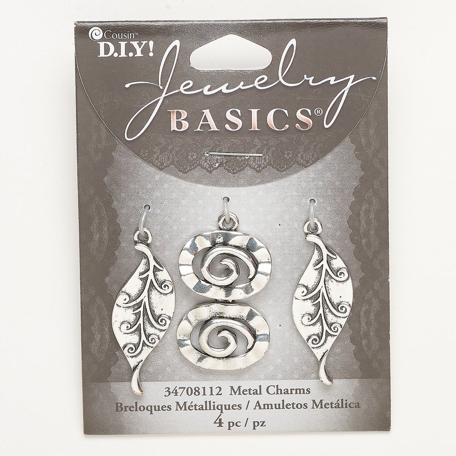 Drop assortment, brass, pkg/4, antique silver finish, 35x15mm leaf/21x16mm wavy oval.