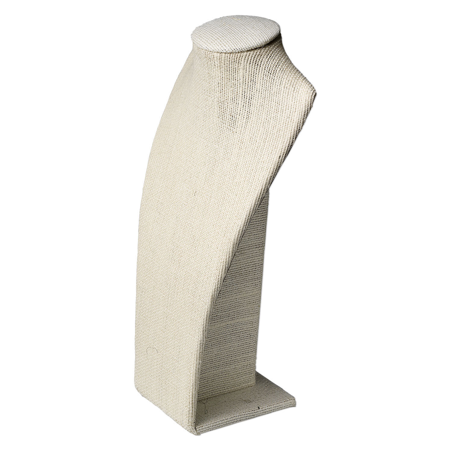 Neutral color, soft texture and sleek lines combine for truly eye-catching displays. Necklaces elegantly drape over "shoulders," and "U" pins easily insert on top and front. Sturdy wood and fiberboard base, white cardboard backing and woven hemp covering with padded neck. An elastic band on the back secures jewelry. Since hemp is a natural product colors may vary from off-white to antique ivory. Colors, shapes and sizes may vary in each lot.