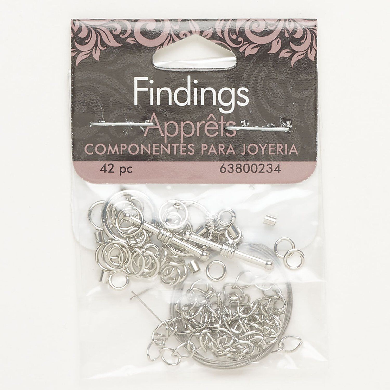 Wire and finding assortment, steel and brass, pkg/42, silver finish, assorted sizes.