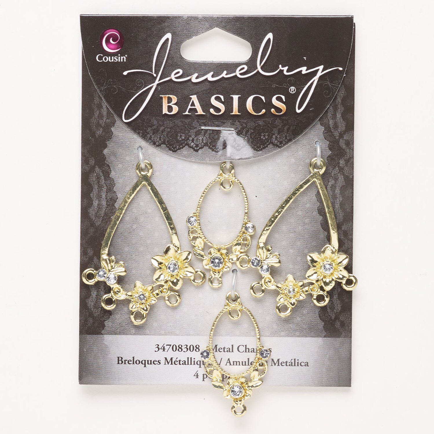 Drop, brass and glass, pkg/4, gold finish and clear, 26x18mm oval and 35x25mm teardrop.