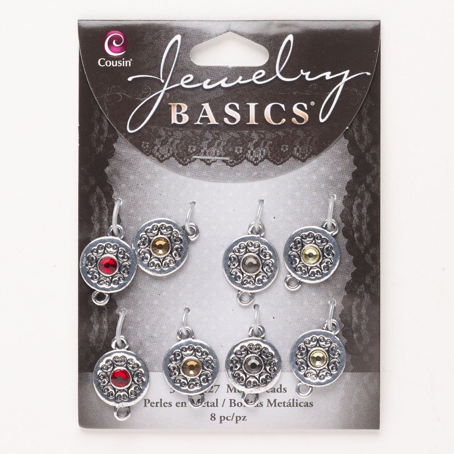 Link assortment, "pewter" (zinc-based alloy) and glass, pkg/8, antique silver finish and mixed colors, 13mm textured round.