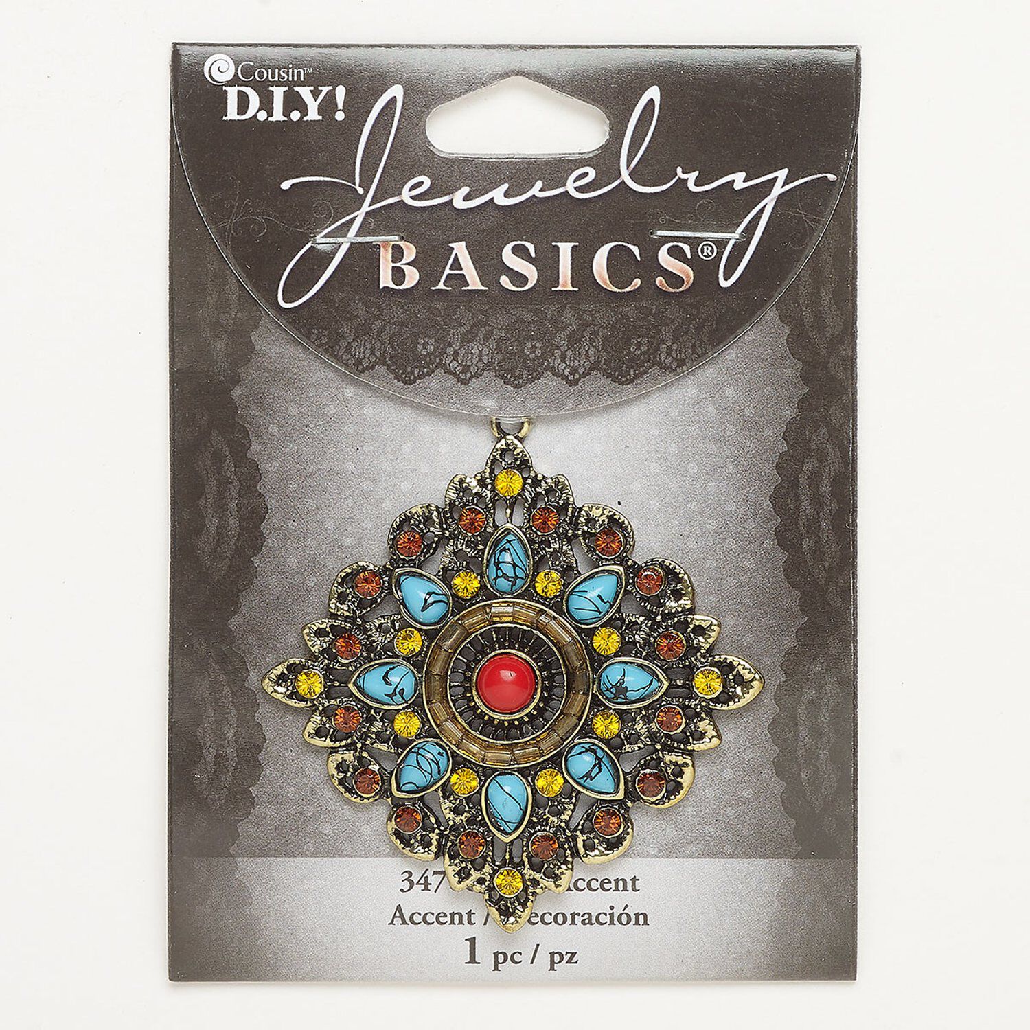 Focal, "pewter" (zinc-based alloy)/acrylic/resin, pkg/1, antique gold finish and multicolored, 50mm fancy diamond.