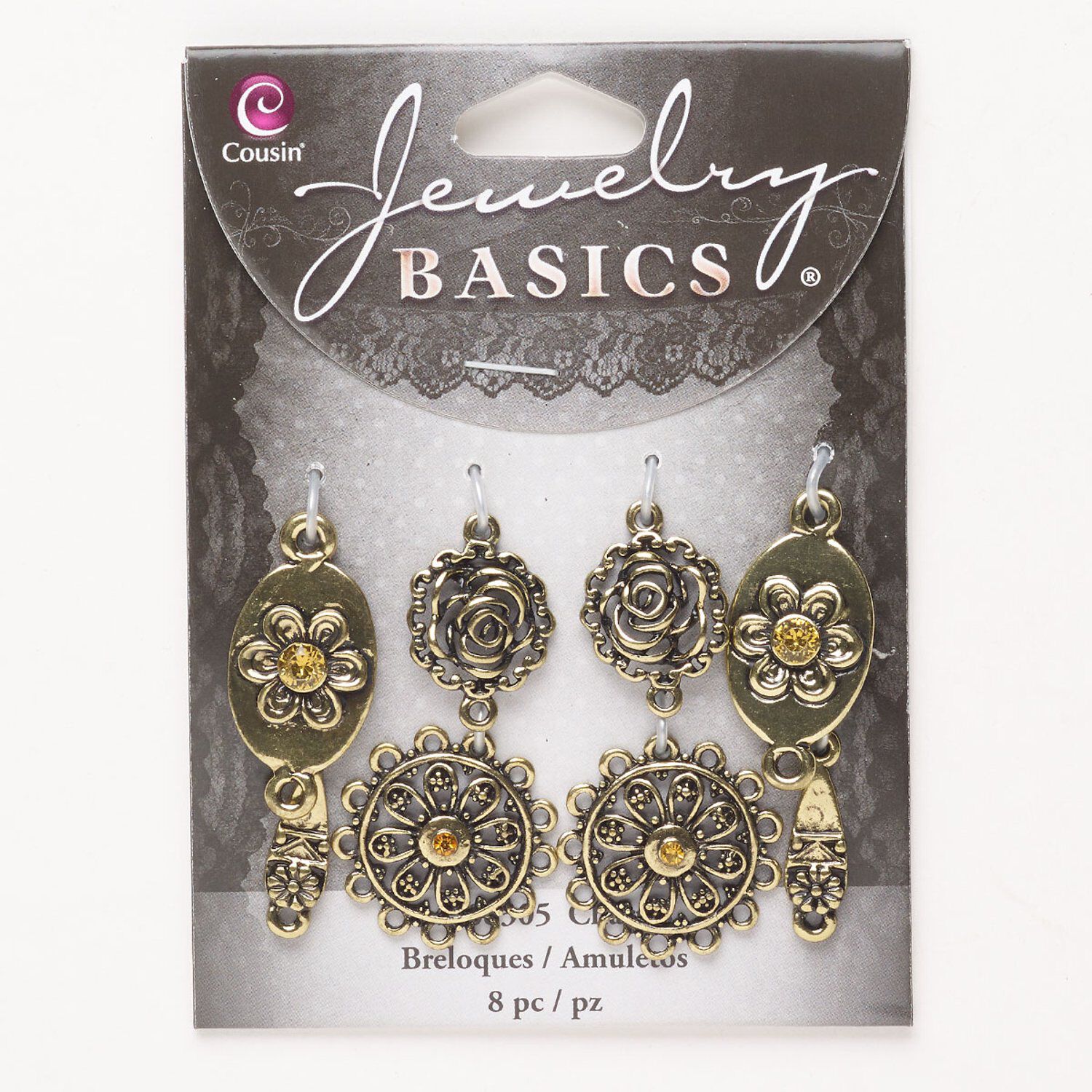 Shapes may include (2) 21mm fancy round, (2) 22x15mm oval with flower, (2) 14x6mm teardrop with flower and (2) 15mm rose.