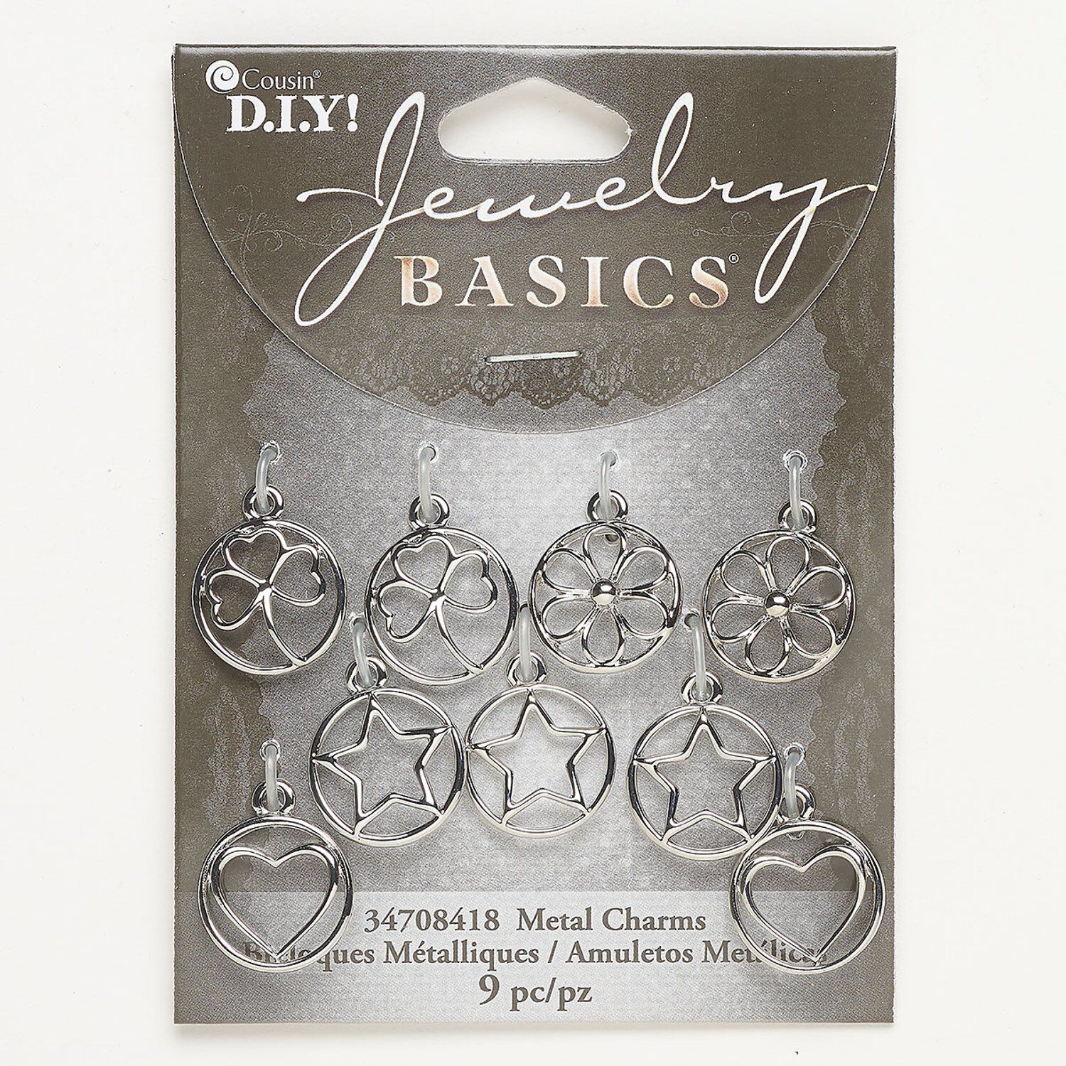 Charm assortment, brass, pkg/9, silver finish, 15mm round.