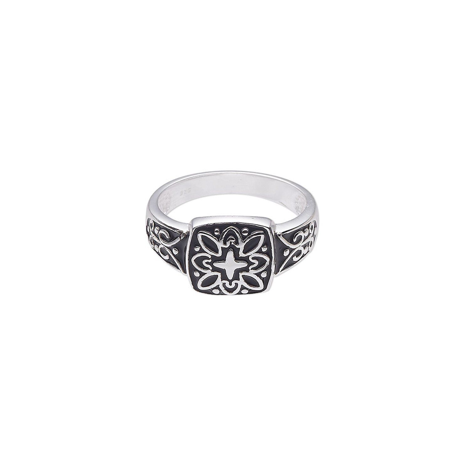 Adorn your (or your customers') fingers with this beautiful size 9 sterling silver ring. Black enamel has been added to highlight the design on the top and ring band.