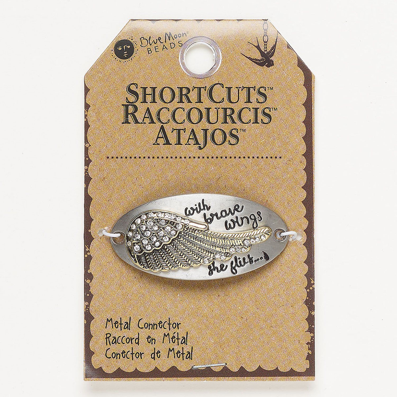 Focal, antique gold- and antique silver-finished brass and glass, clear, 42x23mm curved oval with wing and "with brave wings she flies" and 2 loops. Sold individually.