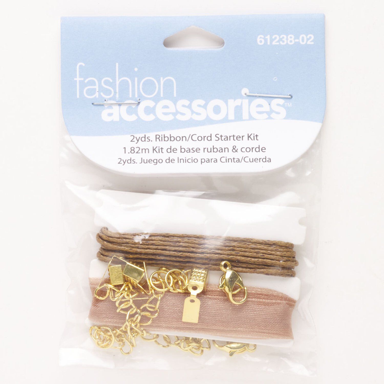 Package contains (1) 1-yard length of 1mm cord, (1) 1-yard length of 10mm ribbon, (4) 9x5mm fold-over crimp ends, (7) 6mm 22-gauge open jump rings, (2) 3-inch curb extender chains and (2) 9x6mm lobster claw clasps.