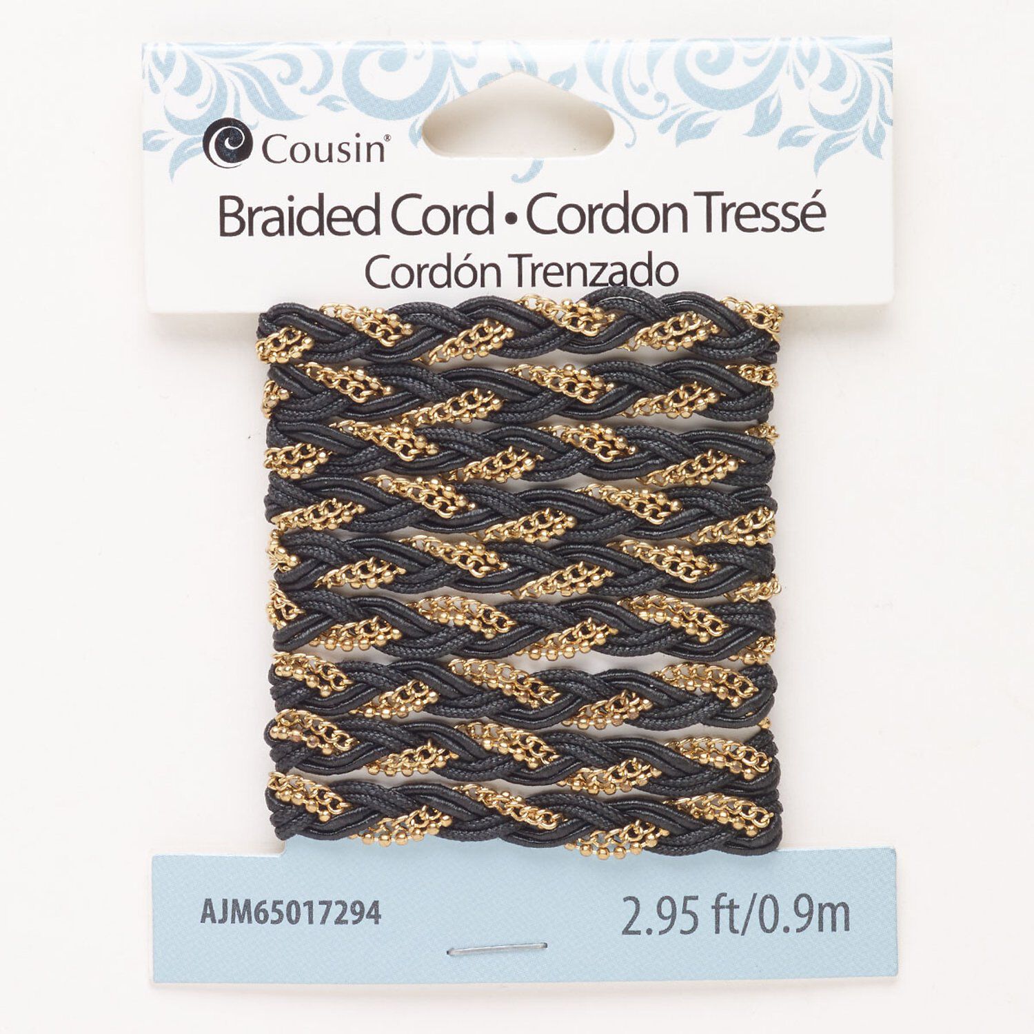 Cord, steel and waxed cotton, pkg/0.9m, gold finish and black, 5.3mm braided flat.