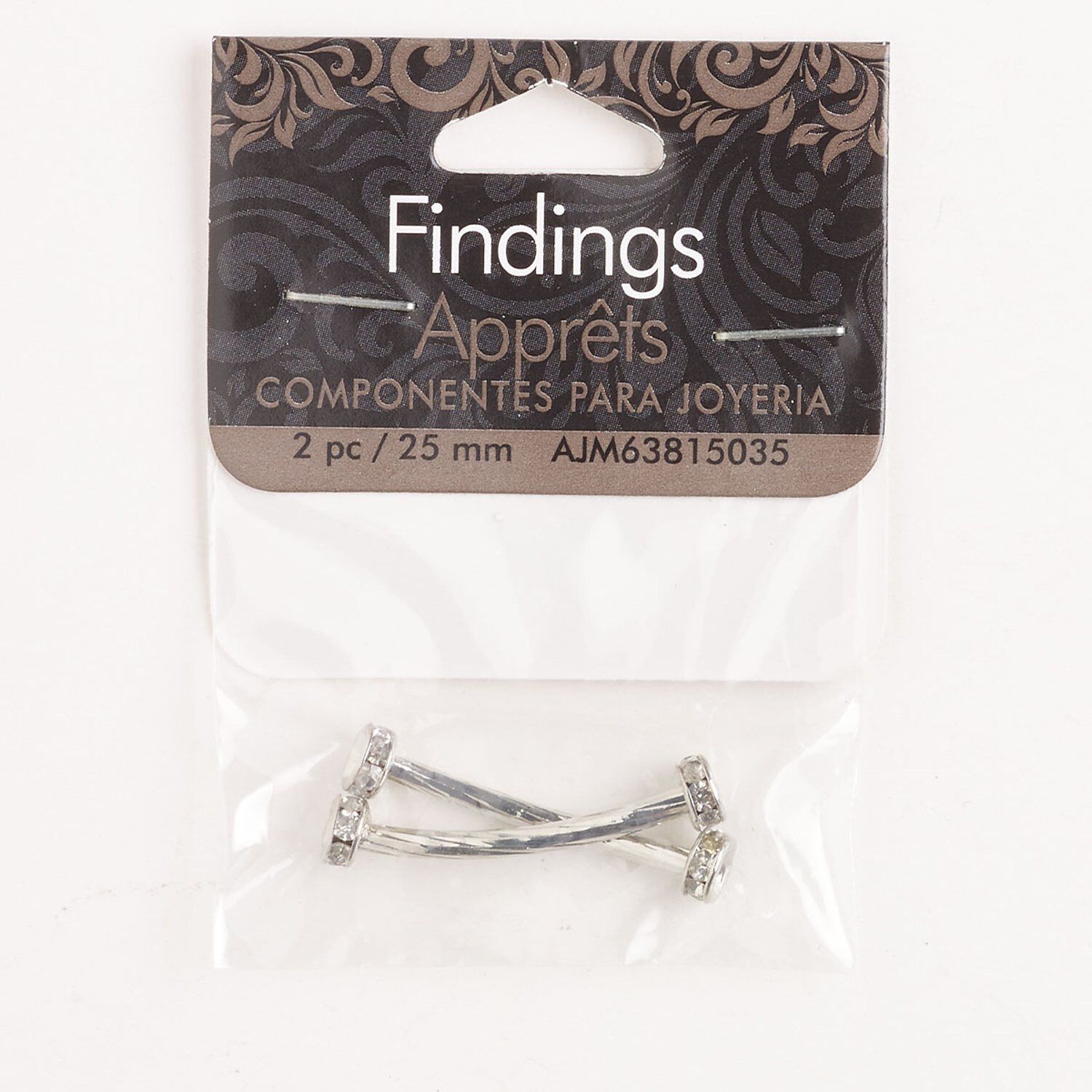 Bead, brass / stainless steel / glass, pkg/2, silver finish and clear, 27x5mm curved bar.