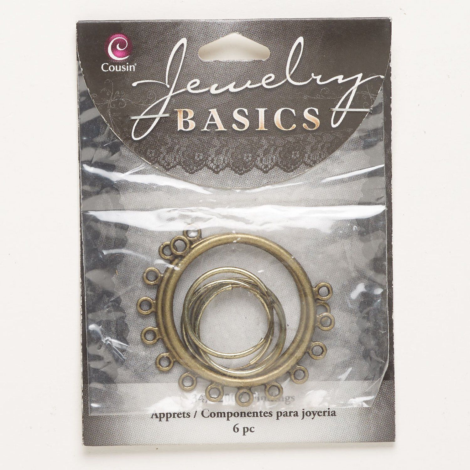 Focal and component assortment, "pewter" (zinc-based alloy) and steel, pkg/3 pairs, antique gold finish, 21mm endless round and 35mm round with 7 closed loops.