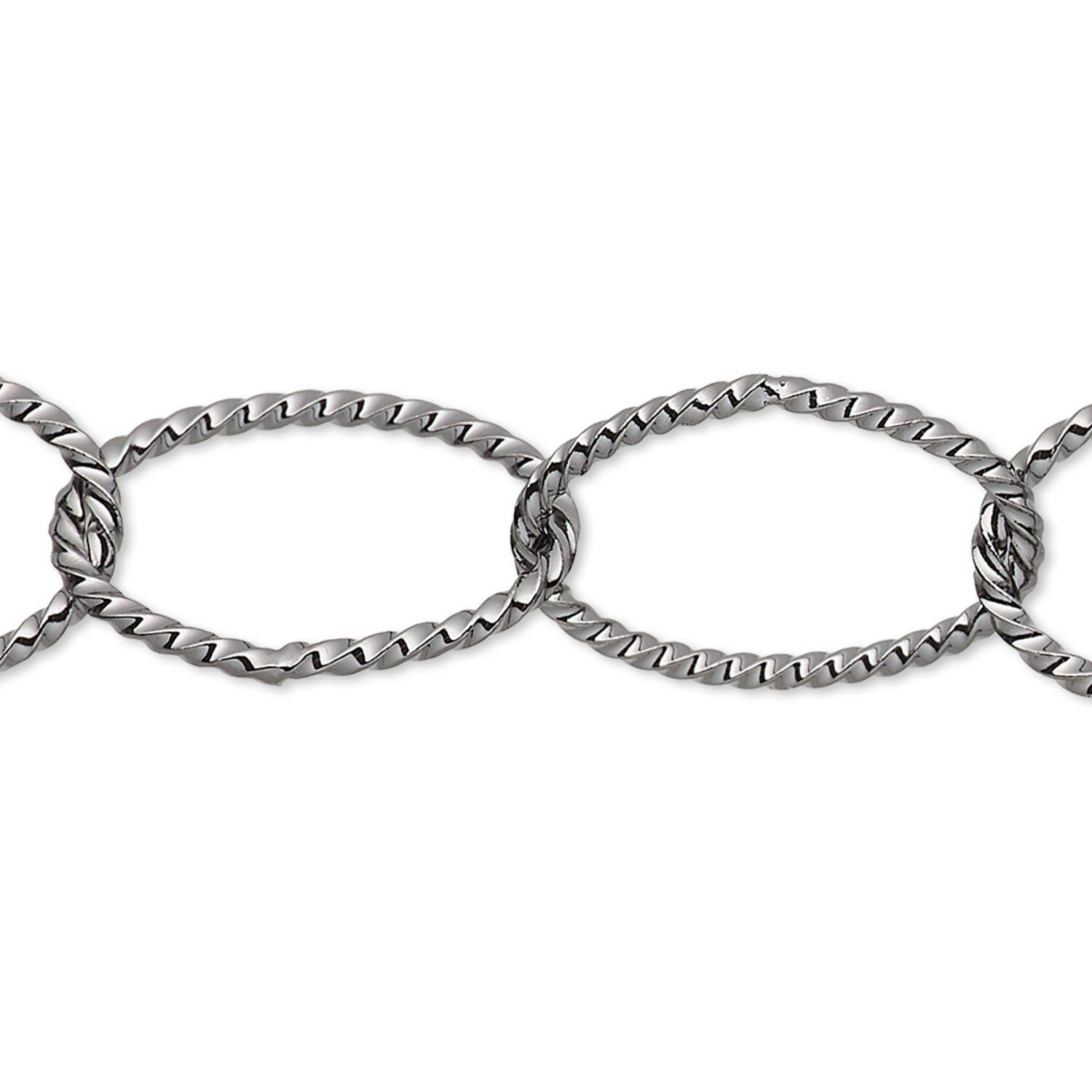Gunmetal-plated brass chain is designed with twisted ovals. Chain is machine-made for solid, consistent links.