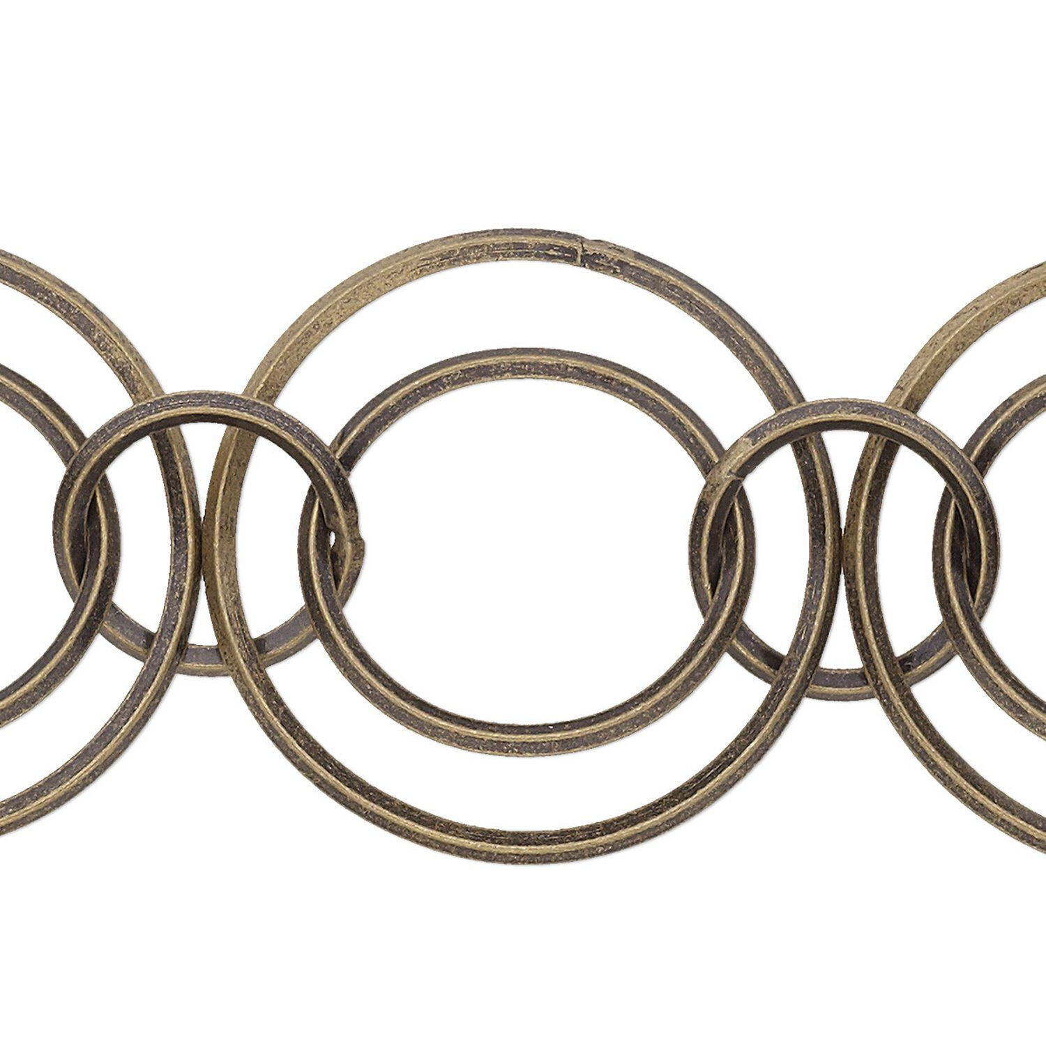 Antique gold-plated brass chain is designed with interlocking rounds. Chain is machine-made for solid, consistent links.