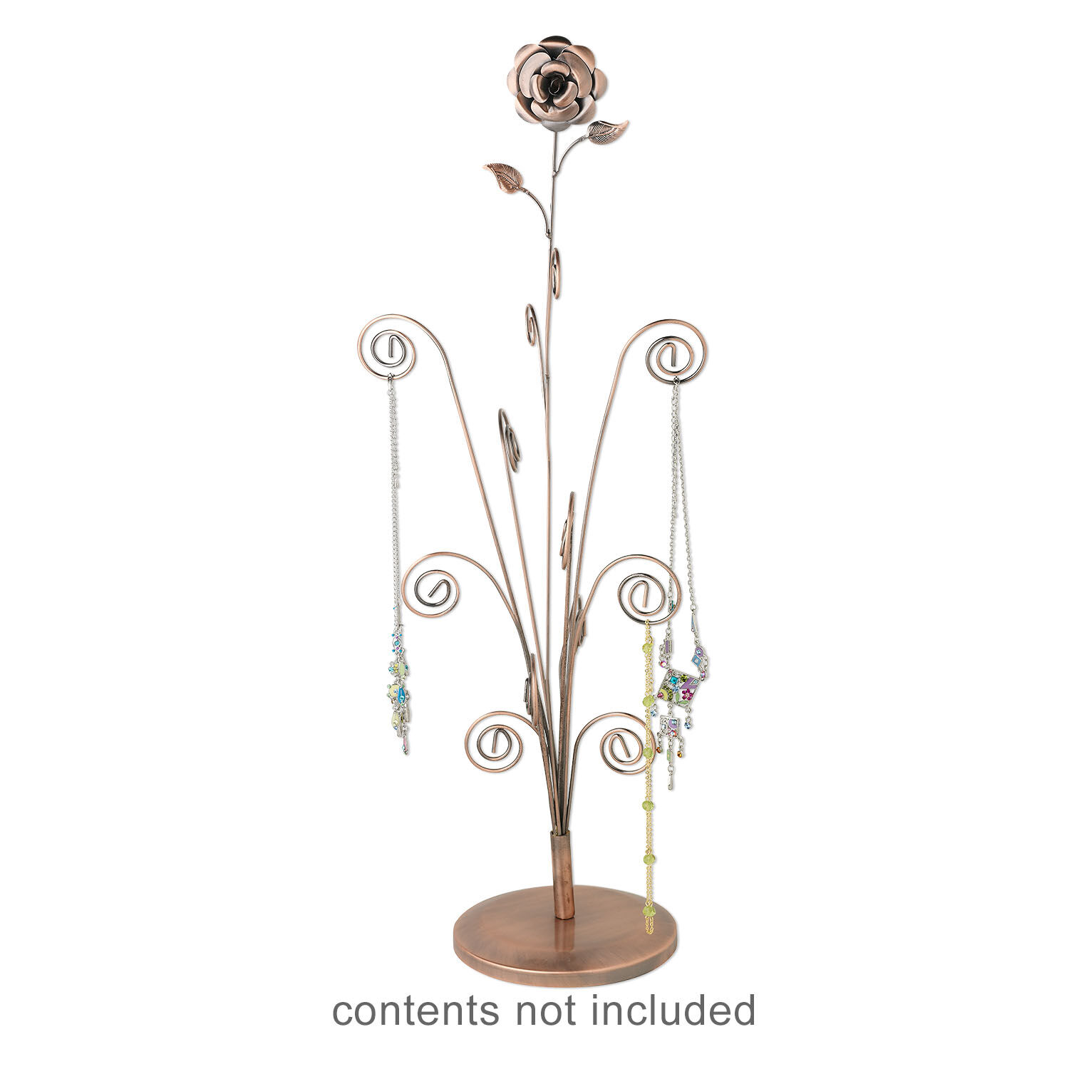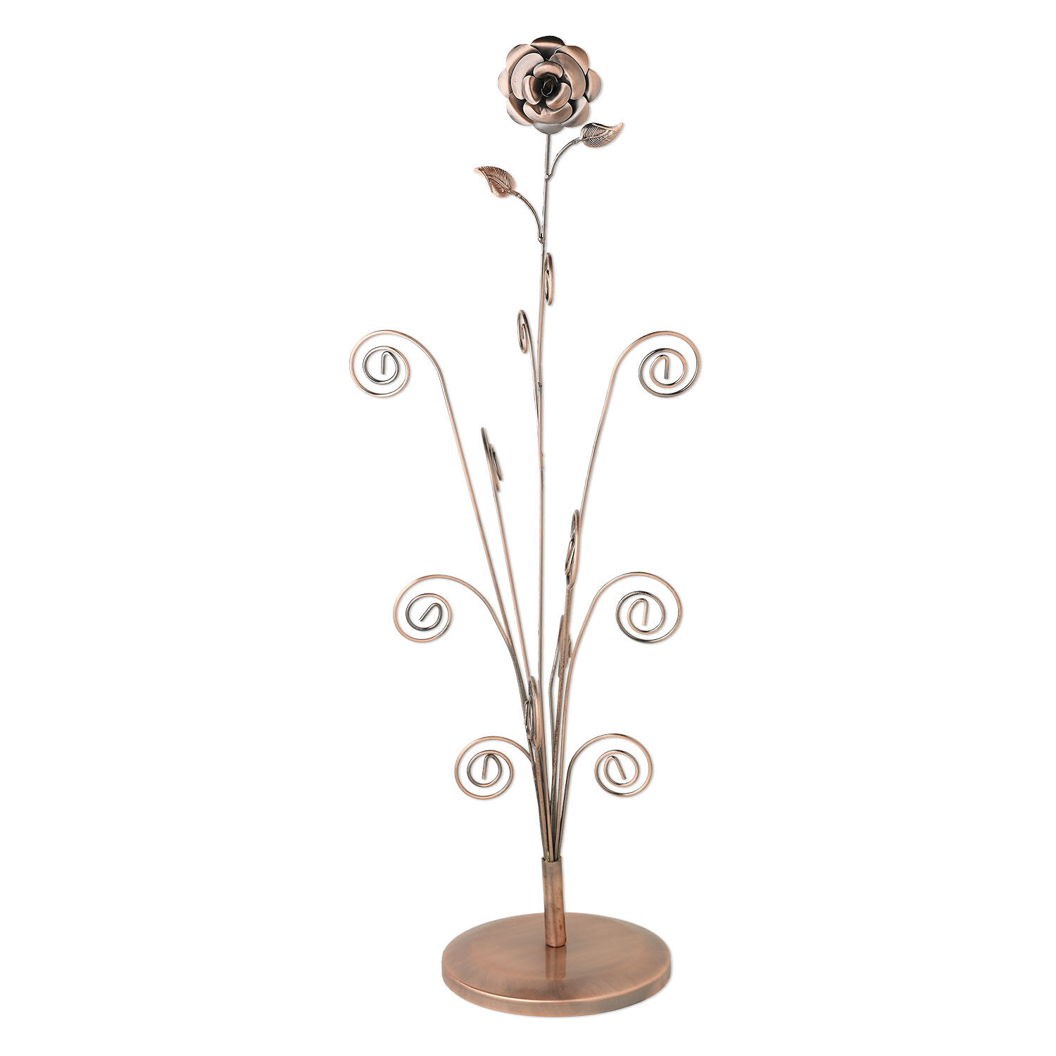 An artful stand blooming with fiddle-fern stems to display necklaces, bracelets, rings, photos and cards. Fashionable flower and decorative leaf design top off the display. Sturdy round base made of steel with a durable antiqued-copper finish. Exclusively available at Fire Mountain Gems and Beads, mix and match with the other displays in the Rose Series for a fabulous presentation for your shop, show, gallery or your home.