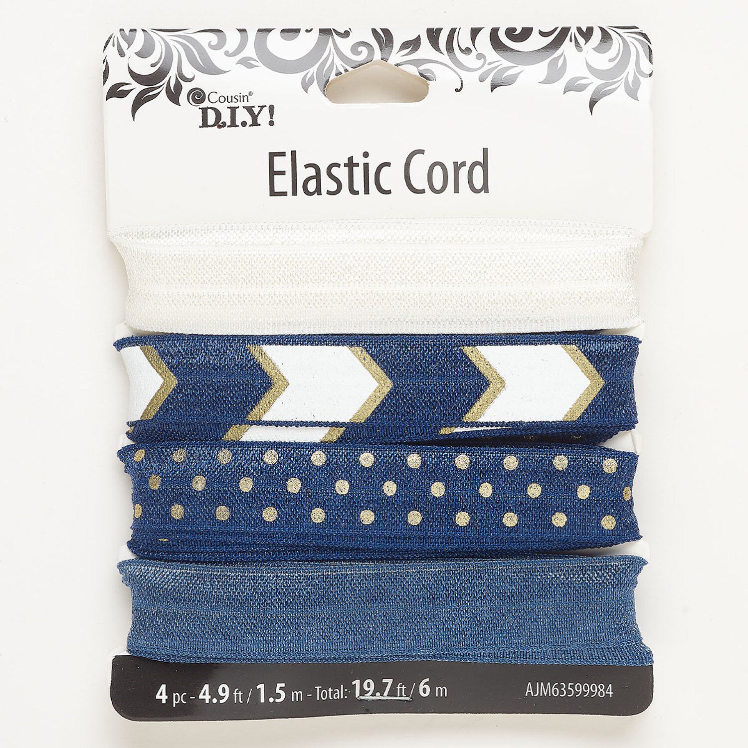Ribbon, elastic and nylon, pkg/(4)1.5m, blues/white/gold, 15mm flat.