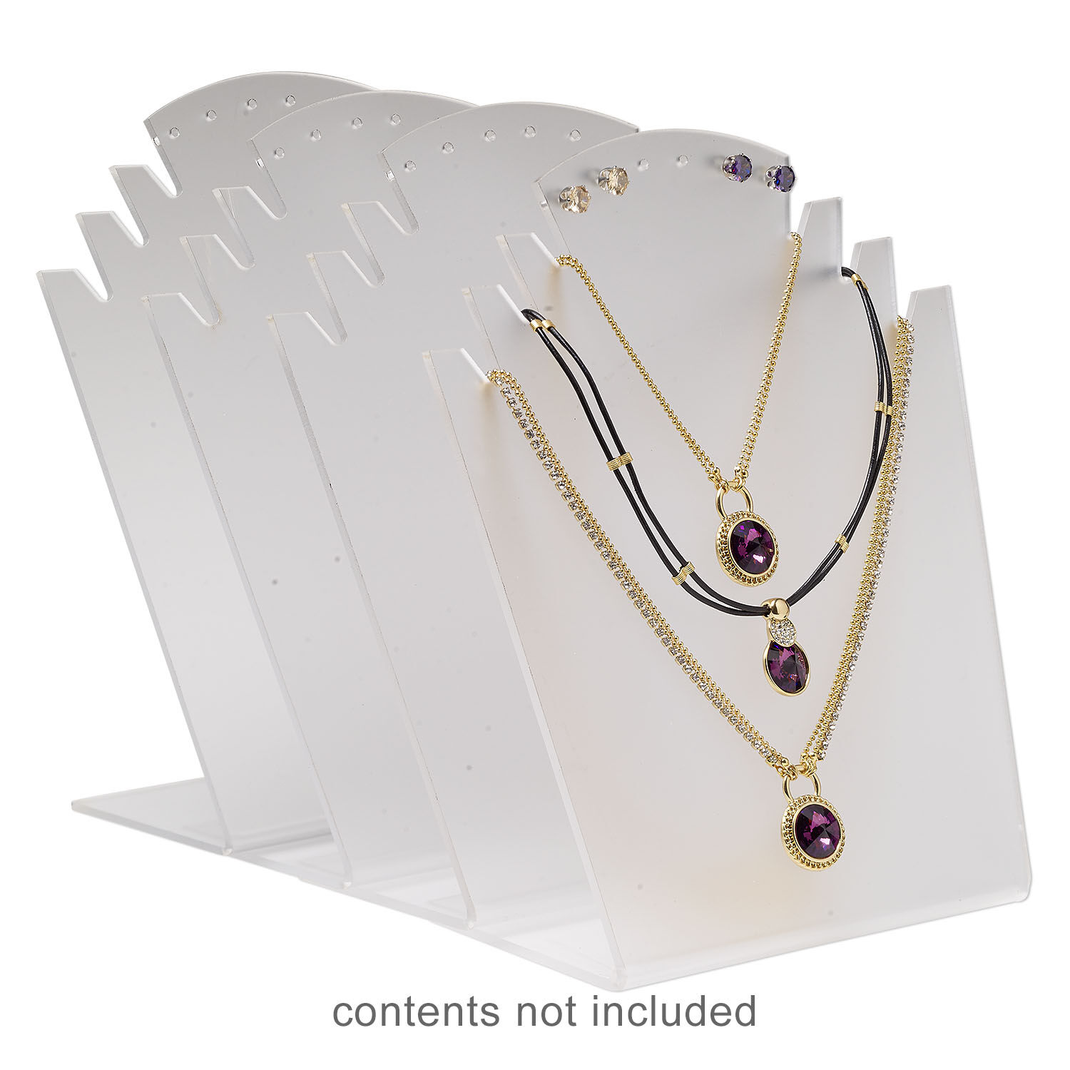 Acrylic display is lightweight for tradeshow travels and sturdy enough to support heavy jewelry designs. Similar styles stack inside each other to consolidate space. Frosted surface helps prevent scratching. Display can exhibit up to three necklaces and features six holes to accommodate up to three pairs of earrings.