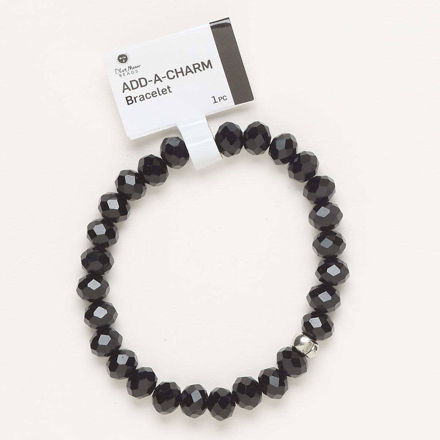 Bracelet, stretch, silver-finished brass and glass, black, 8mm faceted rondelle and 5x6mm rondelle with bottom loop, 6-1/2 inches. Sold individually.
