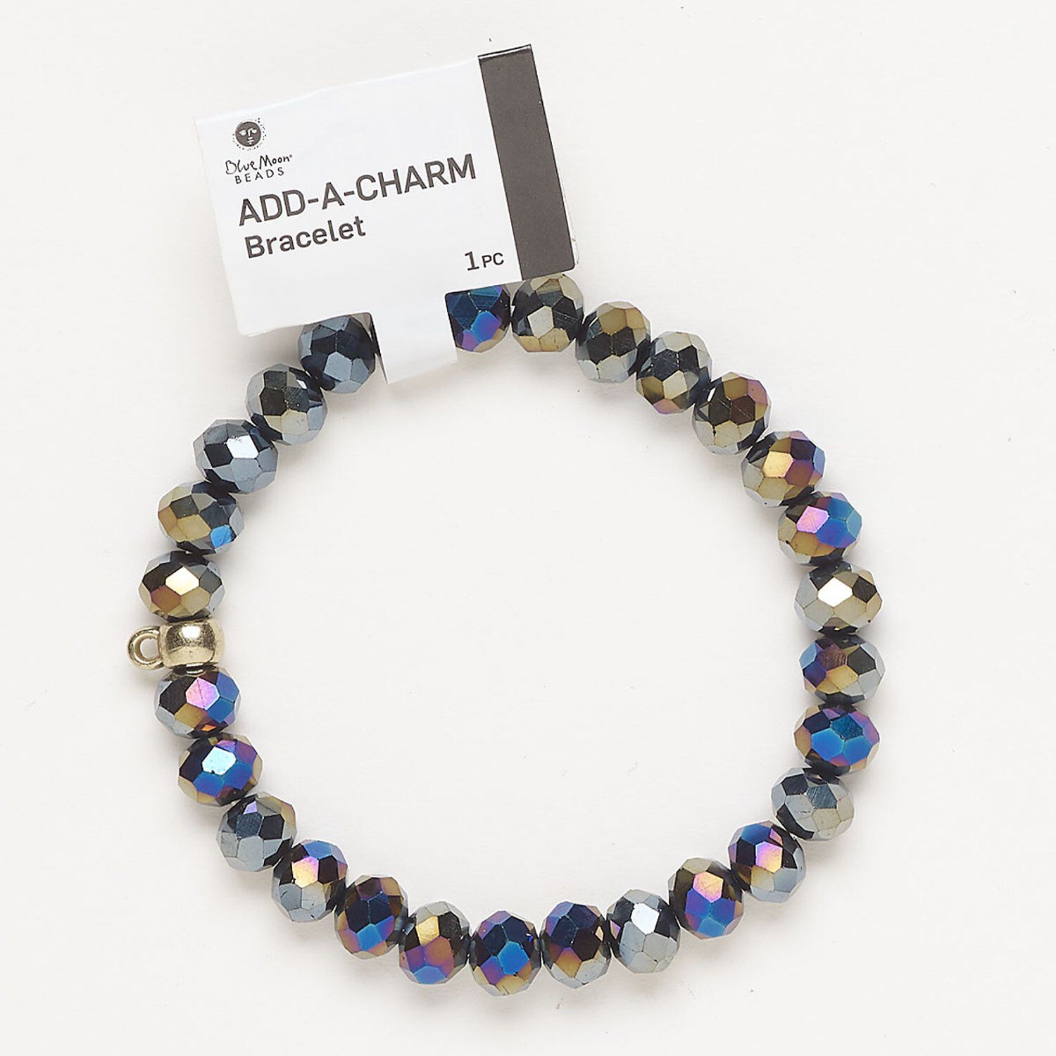 Bracelet, stretch, gold-finished brass and glass, peacock AB and gunmetal, 8mm faceted rondelle and 5x6mm rondelle with bottom loop, 6-1/2 inches. Sold individually.