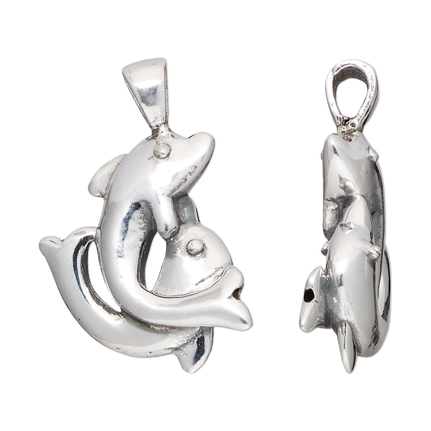 Pendant, antiqued fine silver and sterling silver, electroformed, 32x21mm double-sided dolphins. Sold individually.
